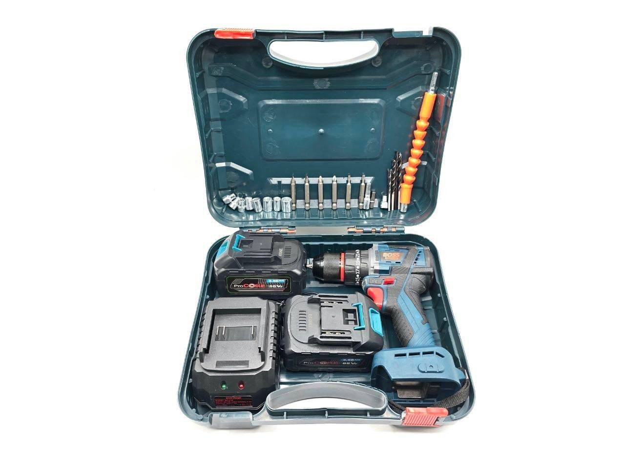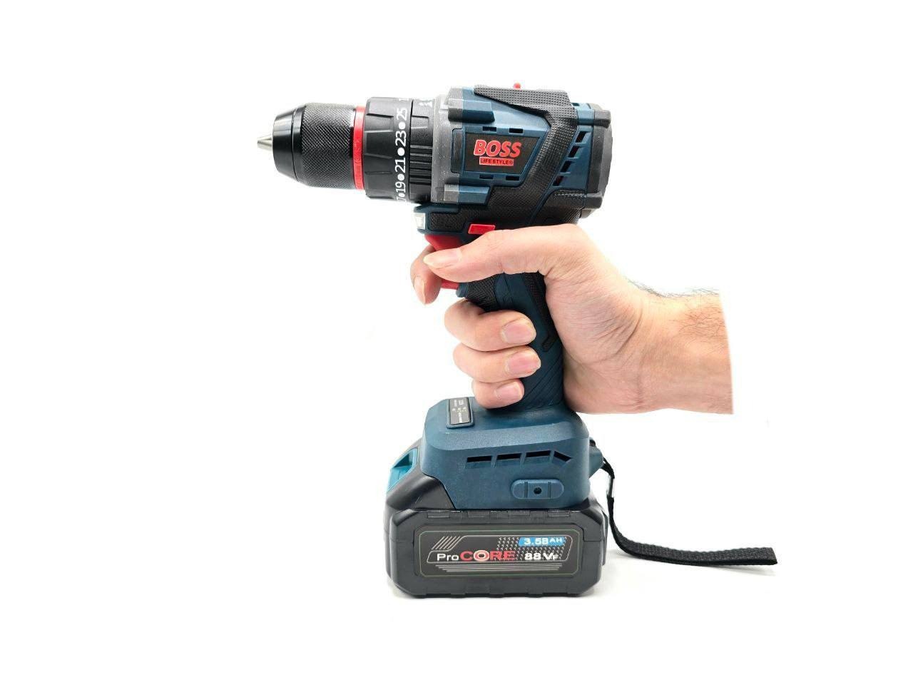 دریل شارژی براشلس چکشی ۸۸ ولت دو باتری باس boss