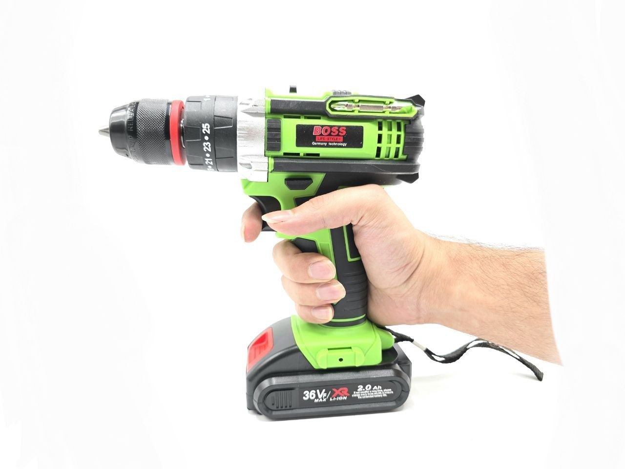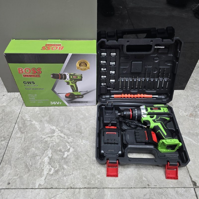 # به همراه لوازم؛ مته آهن( سایز ۴، ۵ و ۶ میلیمتر)، مته چوب( سایز ۴، ۵ و ۶ میلیمتر)، رابط فنری تاشونده، سه عدد نوک پیچ گوشتی دوسو، سه عدد چهارسو، ۹ عدد بکس، و تبدیل بکس خور سر دریلی سایز ۱/۴